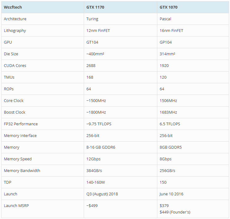 น่าสนใจว่ารุ่นรอง Top ยังแรงขนาดนี้ แล้ว GTX 1180 จะแรงมากขนาดไหน ด้านล่างนี้เป็นตารางเปรียบเทียบสเปกระหว่าง GTX 1170 กับ GTX 1070 ทั้งนี้คาดว่า NVIDIA จะเปิดตัวอย่างเป็นทางการในช่วงเดือนสิงหาคมที่จะถึงนี้ ในราคาประมาณ $499 (ราวๆ 16,700 บาท)
