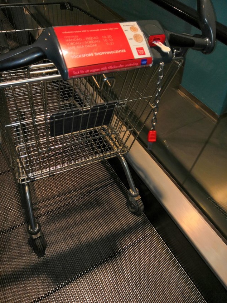 3. ตะกร้ารถเข็นช้อปปิ้งในประเทศสวีเดน (Sweden) มีล้อที่ล็อกเข้ากับบันไดเลื่อนได้ ทำให้มันไม่ไหลลงบันไดเลื่อน (ของแบบนี้ที่ไทยก็มีเนอะ)