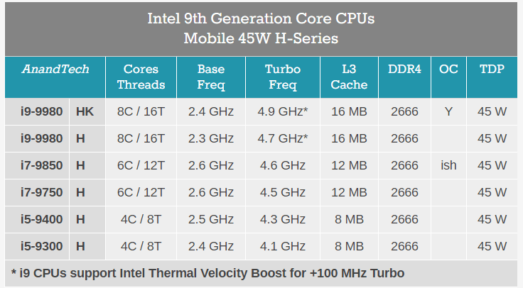 ซีพียูตัวแรงสุดสุดจะเป็น Core i9-9980HK ที่ทำ Turbo speed ได้ถึง 5GHz แถมยังปลดล็อกมาให้ด้วย ทำให้ผู้ใช้สามารถ Overclocked เพื่อเร่งความเร็วให้สูงขึ้นไปได้อีก เป็นซีพียูระดับ 8 Cores 16 Threads มี Cache ใหญ่ถึง 16 MB อีกทั้งยังสนับสนุน Wi-Fi 6 ที่ทำความเร็วได้ถึง 2.4Gbps อีกด้วย