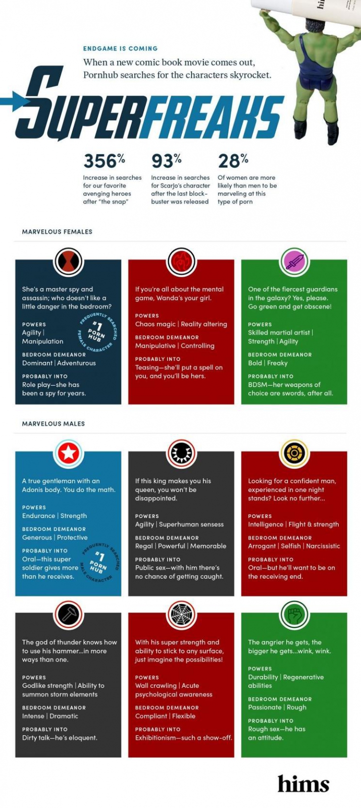 และใน Infographic นี้ยังสรุปได้อีกว่า ฮีโร่ที่ทั้งชายและหญิงมักจะค้นหาใน Pornhub คือใคร โดยฮีโร่หญิงอันดับแรกที่ถูกค้นหามากที่สุดคือ Black Widow และ Scarlet Witch, Gamora ตามลำดับ ส่วนฮีโร่ชายอันดับแรกที่ถูกค้นหามากที่สุดคือ Captain America และ Black Panther, Iron Man ตามลำดับ แต่เทพเจ้าสายฟ้าอย่าง Thor ก็ตกลงมาอยู่อันดับสี่ ตามมาด้วย Spider-Man และปิดท้ายด้วย Hulk