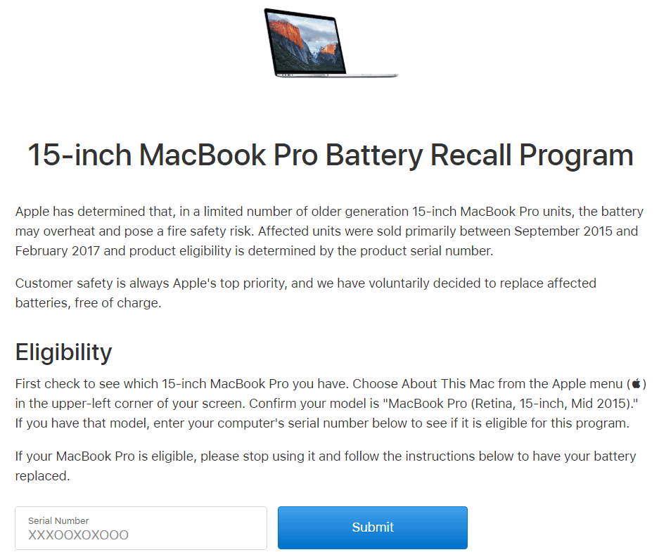 moonlightkzApple ประกาศเรียกคืน MacBook Pro 2015 รุ่น 15 นิ้ว ที่วางจำหน่ายในช่วงเดือนกันยายน 2015 ไปจนถึง กุมภาพันธ์ 2017 หลังพบว่าแบตเตอรี่อาจจะเกิด Overheat และเสี่ยงต่อการลุกไหม้ โดยสามารถตรวจสอบว่าเครื่องของคุณมีปัญหาดังกล่าวหรือไม่ได้ด้วยการนำหมายเลข Serial number ของเครื่องไปเช็คได้ที่ https://support.apple.com/15-inch-macbook-pro-battery-recall