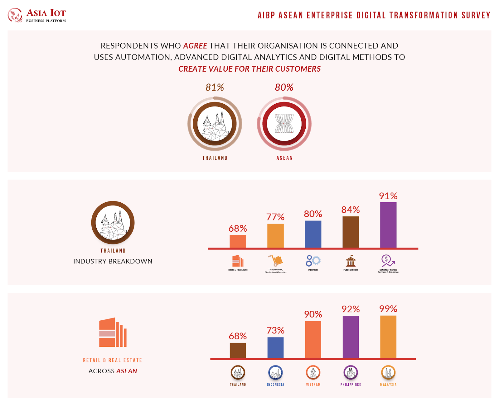 Enterprise Digital Transformation ที่พบว่า 74% ของผู้นำธุรกิจในประเทศไทยเชื่อมต่อเนื้อหากับเทคโนโลยีหลากหลายประเภท เมื่อเทียบกับ 48.6% ในฟิลิปปินส์ที่โครงสร้างพื้นฐานการเชื่อมต่อยังคงเป็นปัญหาอยู่