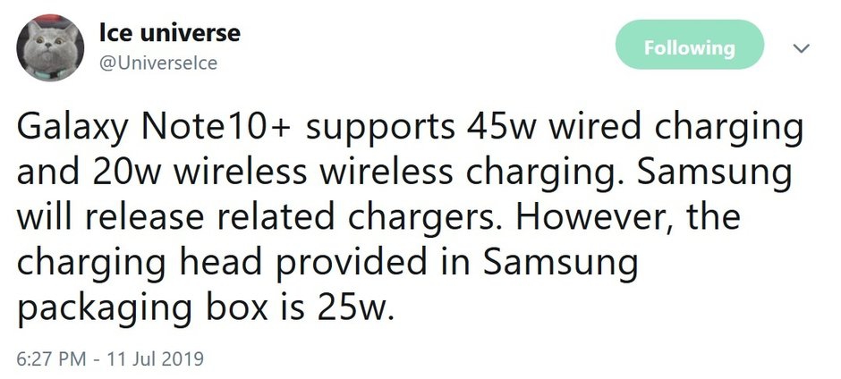 ส่วนอีกเรื่องที่น่าสนใจของ Samsung Galaxy Note10+ ที่น่าสนใจก็คือเรื่องของการรองรับชาร์จด่วน 45w โดยข้อมูลนี้มาจากแอคเคาท์ทวิตเตอร์ 'Ice universe'