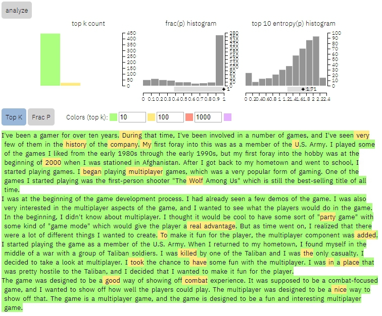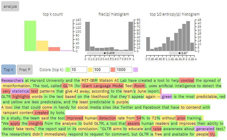 โดยตัว GLTR ที่ว่านี้ทางนักวิจัยเปิดให้เข้าไปใช้ฟรีด้วย ที่เว็บไซต์นี้เลย https://gltr.io/dist/index.html