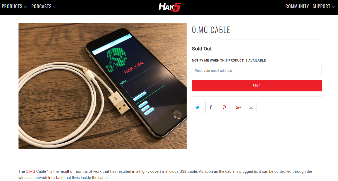 สายชาร์จไอโฟนข้างต้นมีชื่อว่า “O.MG cables” พัฒนาโดย Mike Grover ซึ่งผู้เชี่ยวชาญด้านความปลอดภัย มีรายงานการค้นพบครั้งแรกโดยสื่อ Motherboard ที่ระบุว่าเห็นมันวางจำหน่ายอยู่ภายในงานสัมมนา Def Con และมีการขายออนไลน์ผ่านเว็บไซต์ Hak5 อีกด้วย ในราคาประมาณ $100