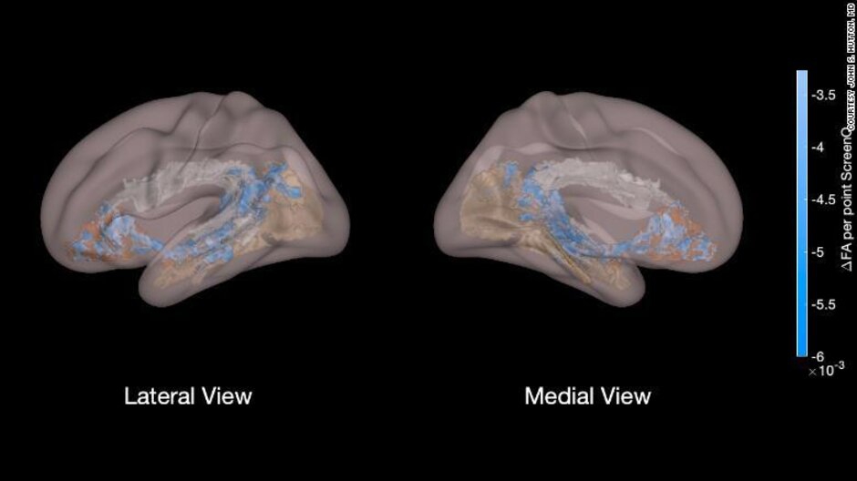 ไฮไลท์สีฟ้าในรูป แสดงถึงพื้นที่ของเนื้อสมองสีขาวที่มีการเติบโตช้าจากการอยู่กับแสงหน้าจอเป็นเวลานานเกินไป