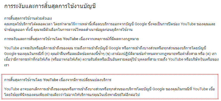 YouTube อาจบอกเลิกการเข้าถึงของคุณ หรือการเข้าถึงบางส่วนหรือทุกส่วนของบริการโดยบัญชี Google ของคุณ ในกรณีที่ YouTube เชื่อโดยใช้ดุยพินิจของตนเพียงฝ่ายเดียวว่าการให้บริการแก่คุณนั้นไม่สามารถใช้งานได้ในเชิงพาณิชย์อีกต่อไป