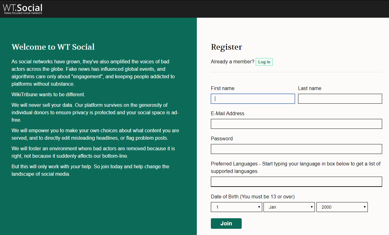 WT:Social (ย่อมาจาก WikiTribune) เป็นโซเชียลเน็ตเวิร์กที่ทาง Jimmy Wales เพิ่งจะเปิดตัวได้ไม่นานมานี้ โดยตัวเขาได้ประกาศว่าจะไม่ใช้โมเดลขายโฆษณาแบบที่ Facebook ทำ เพราะมันทำให้ News Feed เต็มไปด้วยเนื้อหาคุณภาพต่ำที่ได้สิทธิ์การแสดงผลเพียงเพราะจ่ายเงิน