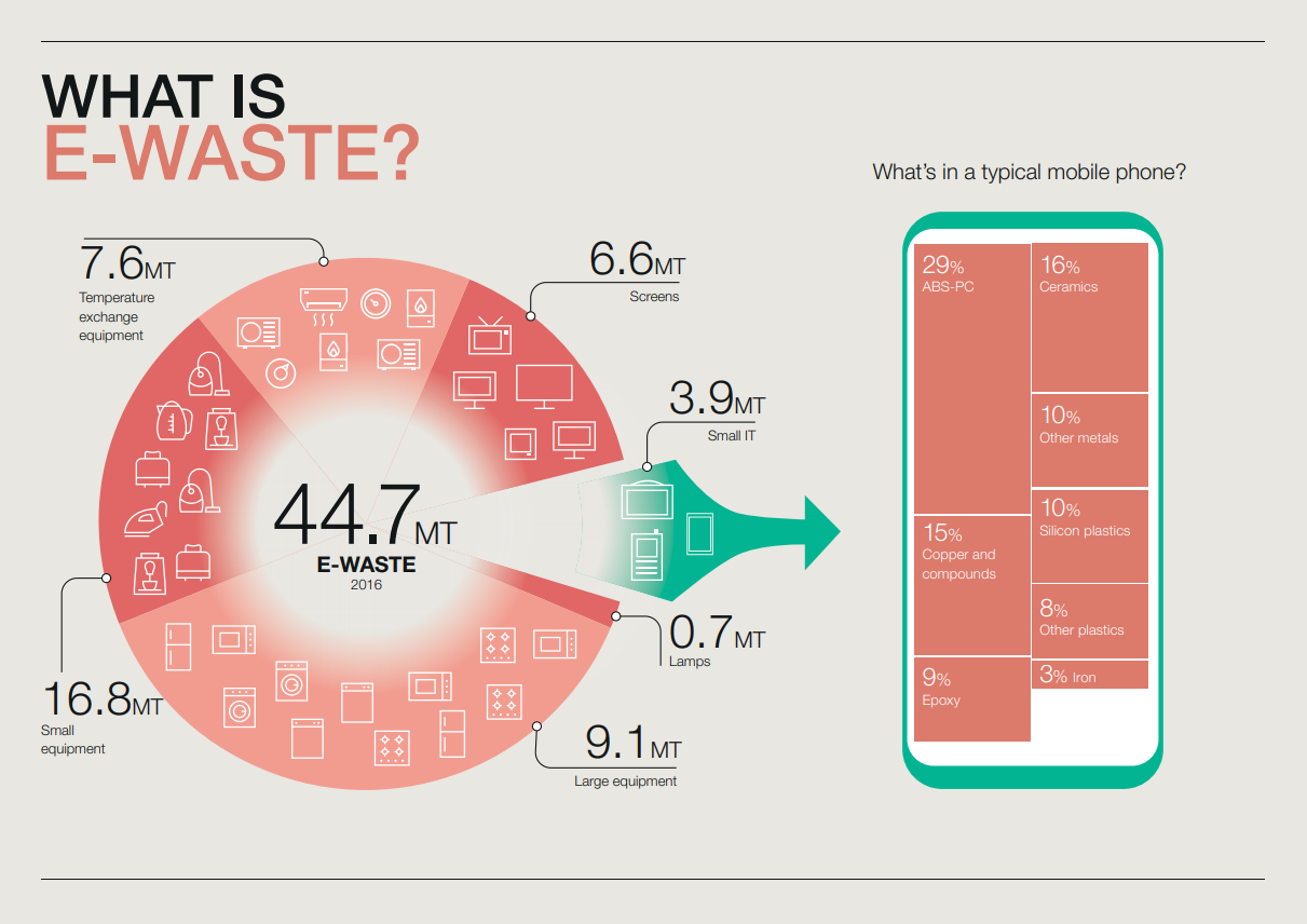 คำว่าขยะอิเล็กทรอนิกส์ (E-Waste) คือขยะจากอุปกรณ์อิเล็กทรอนิกส์ที่หมดอายุการใช้งาน ชิ้นส่วนพัง บางครั้งเกิดจากแม่บ้านอยากได้เครื่องใหม่จากโฆษณาในทีวี จากข้อมูล ปี 2016 ขยะอิเล็กทรอนิกส์มีมากถึง 44.7 ล้านตัน (ทั่วโลก) โดยแบ่งออกเป็น ขยะจากอุปกรณ์ปรับอุญหภูมิ 7.6 ล้านตัน อุปกรณ์ชิ้นเล็กๆ 16.8 ล้านตัน อุปกรณ์ชิ้นใหญ่ 9.1 ล้านตัน จอทีวี 6.6 ล้านตัน และในอุปกรณ์ไอที ชิ้นเล็กๆ 3.9 ล้านตัน โดยในตัวอุปกรณ์ไอที มีส่วนประกอบส่วนใหญ่เป็น พลาสติก ABS, เซรามิก, ทองแดง ตามลำดับ
