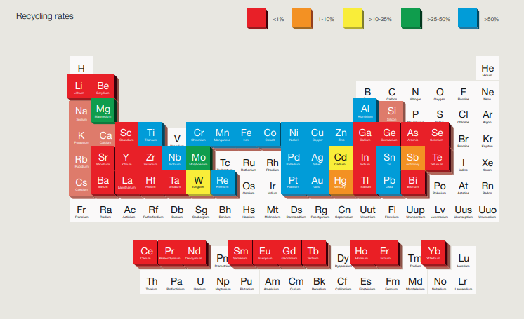จะเห็นได้ว่า ยังมีสารประกอบที่มีความต้องการในการผลิตอุปกรณ์อิเล็กทรอนิกส์ เป็นจำนวนมาก แต่การนำกลับมาใช้ใหม่ (Recycle) ยังทำได้ไม่เทียบเท่ากับความต้องการ โดยธาตุบางอย่างก็ยังมีความต้องการสูง ดูได้จากตารางอัตราการนำกลับมาใช้