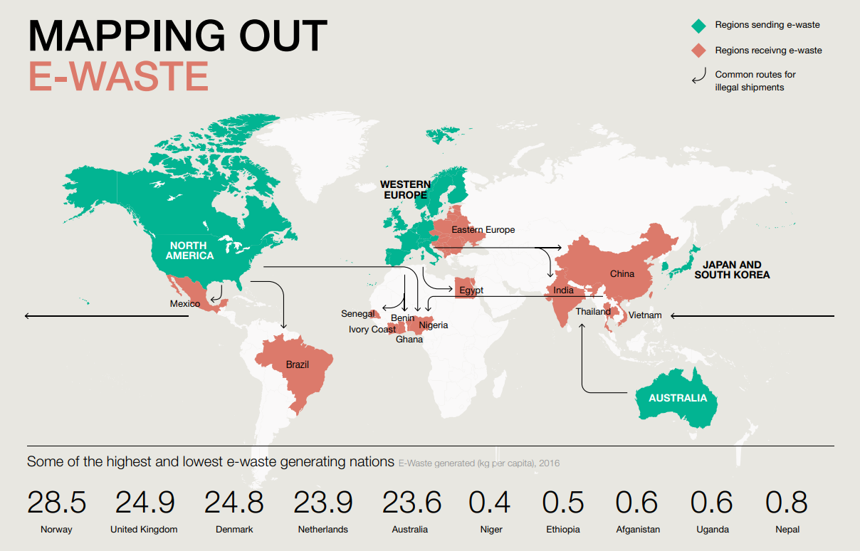 ขยะอิเล็กทรอนิกส์ เป็นขยะที่มีอัตราเพิ่มจำนวนมากที่สุดในโลก จากข้อมูลในปี 2018 มีขยะอิเล็กทรอนิกส์มากขึ้น 48.5 ล้านตัน ทั่วโลกมีความสามารถในการกำจัดขยะอิเล็กทรอนิกส์ได้เพียงแค่ 20% โดยวิธีการกำจัดส่วนใหญ่ใช้วิธีฝังกลบ ทุกวันนี้ยังไม่มีประเทศไหนที่จัดการเรื่องนี้แบบจริงจัง (ในประเทศไทยมีกฎหมายห้ามนำเข้าขยะอิเล็กทรอนิกส์อย่างชัดเจน แต่ก็ยังเป็นปลายทางในการทิ้งขยะอิเล็กทรอนิกส์)