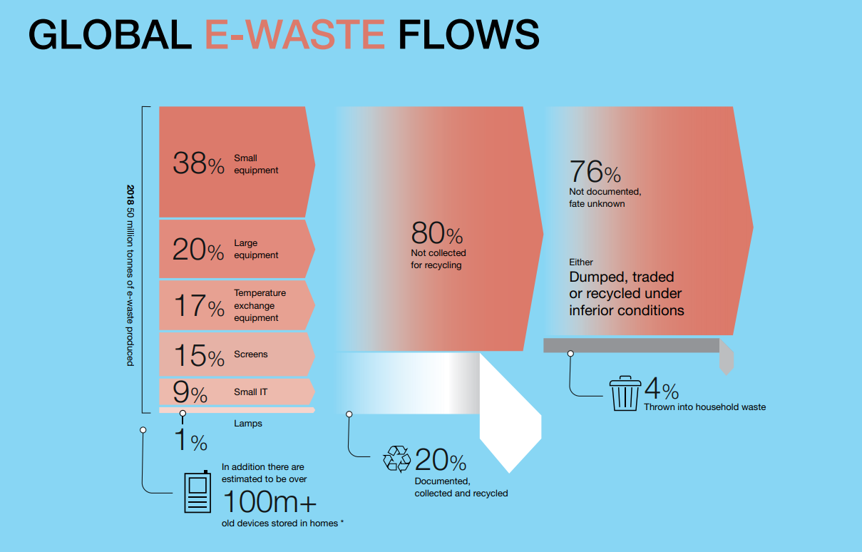 จากข้อมูลจะเห็นได้ว่าการต้องการวัสดุมาผลิตอุปกรณ์อิเล็กทรอนิกส์มีจำนวนมาก แต่ความสามารถในการนำกลับมาใช้ใหม่น้อยมาก ทำให้เกิดขยะอิเล็กทรอนิกส์ที่ไม่สามารถกำจัดได้เยอะมาก จากการคำนวณ คือ 50 ล้านตันต่อปี นึกออกไหมครับว่าเยอะแค่ไหน เอาง่ายๆ ขยะเยอะขนาดนี้สามารถ ทำเครื่องบินพาณิชย์ได้ 125,000 ลำเยอะไหมล่ะครับ จากการคาดคะเน ขยะอิเล็กทรอนิกส์จะมีมากถึง 120 ล้านตันในปี 2050 โดยเมื่อสองปีที่แล้ว (2018) มีขยะอิเล็กทรอนิกส์ฝังตัวอยู่ตามบ้าน มากกว่า 100 ล้านชิ้น ทั่วโลก 80% ของขยะที่ว่า ไม่ได้ถูกนำมาจัดการอย่างถูกต้อง (20% นำกลับมากำจัดและแยกชิ้นส่วนอย่างถูกต้อง) และคาดว่า 76% อยู่ในสถานะ กำจัดไม่ถูกต้องหรือแค่โยนใส่ถังขยะ
