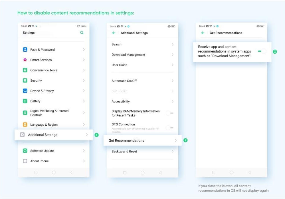 จริงๆ แล้วการฝังโฆษณาบนมือถือที่เราต้องจ่ายเงินซื้อมา ก็ดูเป็นการล่วงล้ำพื้นที่ส่วนตัวอยู่พอสมควรเหมือนกัน เมื่อเทียบกับพื้นที่โฆษณาอื่นๆ (แต่ก็เป็นโมเดลสมาร์ทโฟนราคาประหยัดที่ผู้ใช้งานต้องยอมรับแต่โดยดี) ทั้งนี้ทั้งนั้น แม้ทาง Realme จะยัดโฆษณาเข้ามาในระบบปฏิบัติการให้กับผู้ใช้อย่างไม่เต็มใจ แต่ทางแบรนด์ก็ได้ออกมาแนะนำถึงวิธีปิดโฆษณาดังกล่าวบนเว็บไซต์คอมมูนิตี้ให้เป็นของขวัญส่งท้ายปี โดยมีขั้นตอนดังนี้