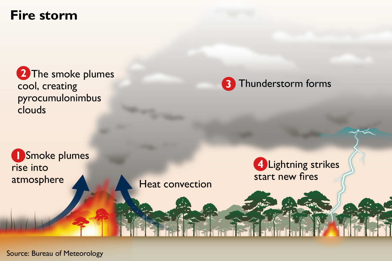 ซึ่งเมื่อวันที่ 4 มกราคมที่ผ่านมา ทางกรมอุตุนิยมวิทยาของประเทศออสเตรเลียก็ได้ออกมารายงานว่า อุณหภูมิในเมือง Canberra (เมืองหลวงของประเทศออสเตรเลียที่อยู่ใกล้กับบริเวณที่เกิดไฟป่า) นั้น มีอุณหภูมิพุ่งขึ้นสูงถึง 43.6 องศาเซลเซียส ที่นับได้ว่าเป็นอุณหภูมิที่ สูงที่สุดในประวัติศาสตร์ เลยก็ว่าได้ และด้วยสภาพอากาศที่ร้อนจัดและควันจากไฟป่านี้ทำให้เกิดการรวมตัวกันก่อให้เกิดเมฆพายุ Pyrocumulonimbus ที่พัดให้ไฟป่าทวีความรุนแรงเพิ่มมากขึ้นจนเกิดเป็นพายุที่สร้างความเสียหายให้กับผู้คนและสัตว์ป่าในบริเวณข้างเคียงเป็นอย่างมาก