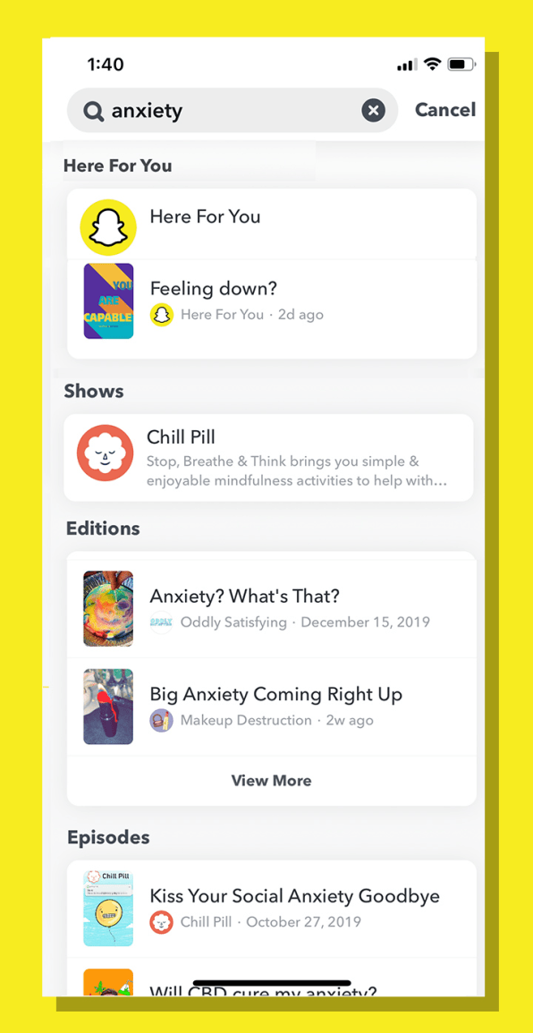 “Snapchat ได้เพิ่มเครื่องมือใหม่เข้ามาช่วยเหลือผู้ใช้ ซึ่งเมื่อผู้ใช้พิมพ์ข้อความที่คล้ายกับการขอความช่วยเหลือ หรือข้อความที่อันตรายต่อสุขภาพและจิตใจ เครื่องมือนี้ก็จะแสดงผลการค้นหาที่จะช่วยให้ผู้ใช้ผ่านพ้นเรื่องราวเหล่านั้นไปได้ เช่น หากผู้ใช้ค้นหาเกี่ยวกับคำว่า ‘เครียด’ ผลการค้นหาก็จะแสดงผลไปที่ ‘Chill Pill’ (ช่อง Snapchat แนะนำการปรับวิธีคิดเพื่อให้อารมณ์สงบลง) และวิดีโอคลายเครียดหรือวิธีคลายเครียดอื่นๆ เรารู้สึกว่ามันเป็นความรับผิดชอบของเราที่จะต้องสร้างพลังบวกให้กลับผู้ใช้ และเราต้องการที่จะให้พื้นที่ส่วนตัวแก่ผู้ใช้ได้เป็นตัวเองอย่างเต็มที่โดยที่ไม่ถูกตัดสินจากบุคคลอื่น”
