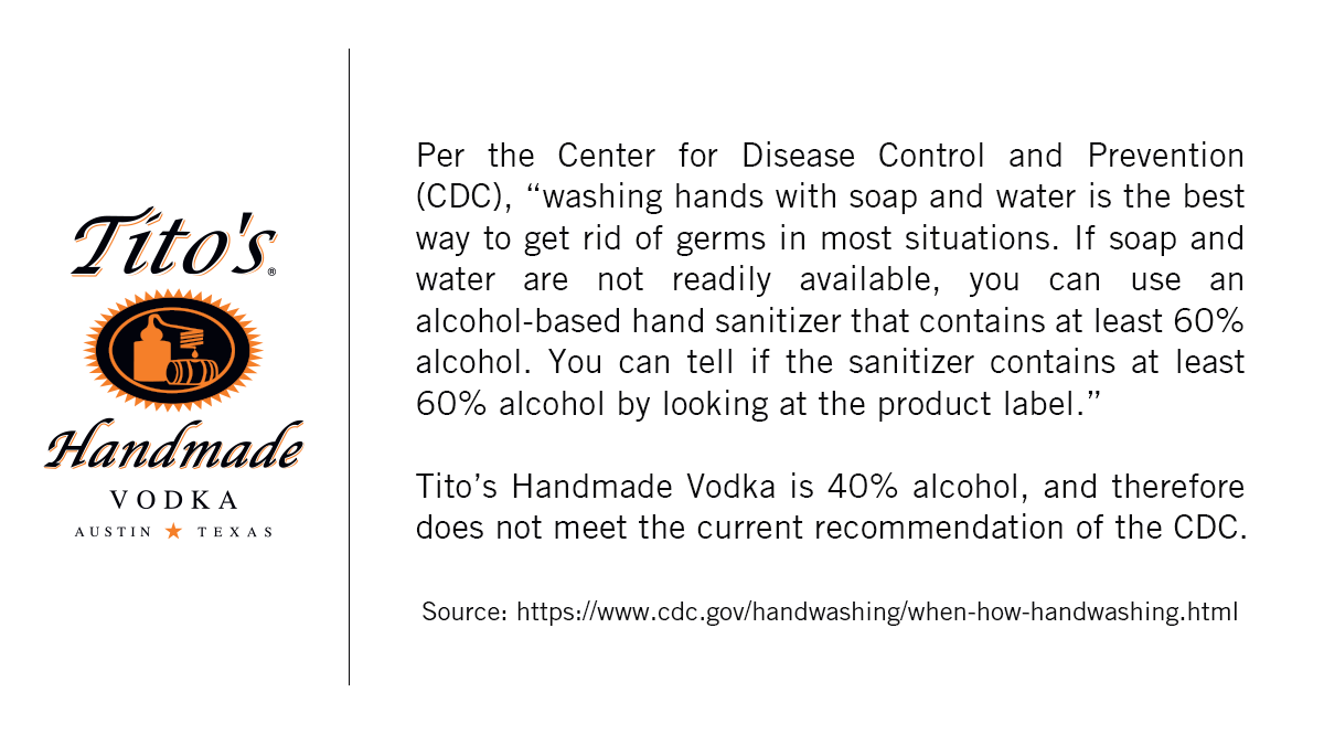 “จากประกาศของ CDC ระบุว่าแอลกอฮอล์เจลควรที่จะมีความเข้มข้นของแอลกอฮอล์อยู่ที่ 60 % ขึ้นไป ในขณะที่ Tito’s Handmade Vodka ของเรานั้นมีแอลกอฮอล์เพียงแค่ 40% เท่านั้น นั่นหมายความว่าเปอร์เซ็นต์แอลกอฮอล์ไม่ถึงเกณฑ์ขั้นต่ำของทาง CDC โปรดอ่านรายละเอียดเพิ่มเติมในรูปที่แนบมาด้านล่าง”