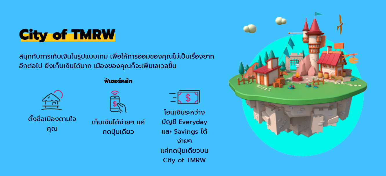 ส่วนอีกแบบที่เกริ่นไว้ตั้งแต่ต้นว่าเป็นธนาคารดิจิทัลที่ทำให้คุณมีเงินฝาก “กองเป็นตึกสูง” ซึ่งอยากแนะนำเป็นอย่างมากคือ “TMRW Saving” หรือบัญชีเงินฝากดอกเบี้ยสูงที่อัปเกรดความสนุกยิ่งขึ้นด้วยการออมเงินในรูปแบบของ “เกมสร้างเมือง” ให้ความรู้สึกเหมือนคนรุ่นใหม่วัยมันที่กำลังเติมเกมเพื่อสร้างเมืองให้ยิ่งใหญ่ไว้อวดเพื่อน แต่เงินเราไม่ได้หายไปไหน และจะอยู่ในบัญชีเงินฝาก หากยิ่งเก็บเงินใน TMRW Saving มากเท่าไหร่ เมืองของคุณก็จะเพิ่มเลเวลเติบโตมากได้เท่านั้น แถมยังสร้างเอกลักษณ์ได้ด้วยการตั้งชื่อเมืองที่ไม่ซ้ำใครฃ และยังได้เงินฝากดอกเบี้ยสูงถึง 1.6 % อีกด้วย เรียกได้ว่าคุ้มทั้งความรู้สึกที่ได้ปลดล็อกความสำเร็จของตัวเอง และความคุ้มค่าของดอกเบี้ยที่มากกว่าใคร