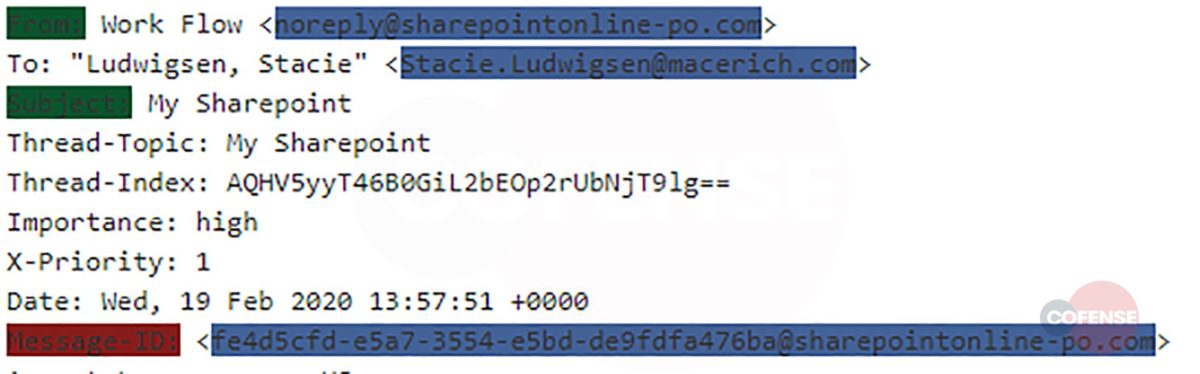 จากการตรวจสอบพบว่าอีเมลจะถูกส่งมากโดเมนปลอม sharepointonline-po.com ที่เพิ่งถูกจดทะเบียนเมื่อวันที่ 19 กุมภาพันธ์ 2563 ที่ผ่านมานี้เอง ซึ่งเป็นความพยายามในการหลอกให้ผู้ใช้เชื่อว่ามาจาก SharePoint แพลตฟอร์มแบบ Web-based ในการทำงานร่วมกันที่เป็นส่วนหนึ่งของ Microsoft Office โดยในอีเมลจะมีเนื้อหาที่หลอกให้เชื่อว่า คุณได้รับไฟล์ที่ถูกอัปโหลดไว้บน SharePoint มีปุ่มสำหรับคลิกเพื่อเปิดดูไฟล์
