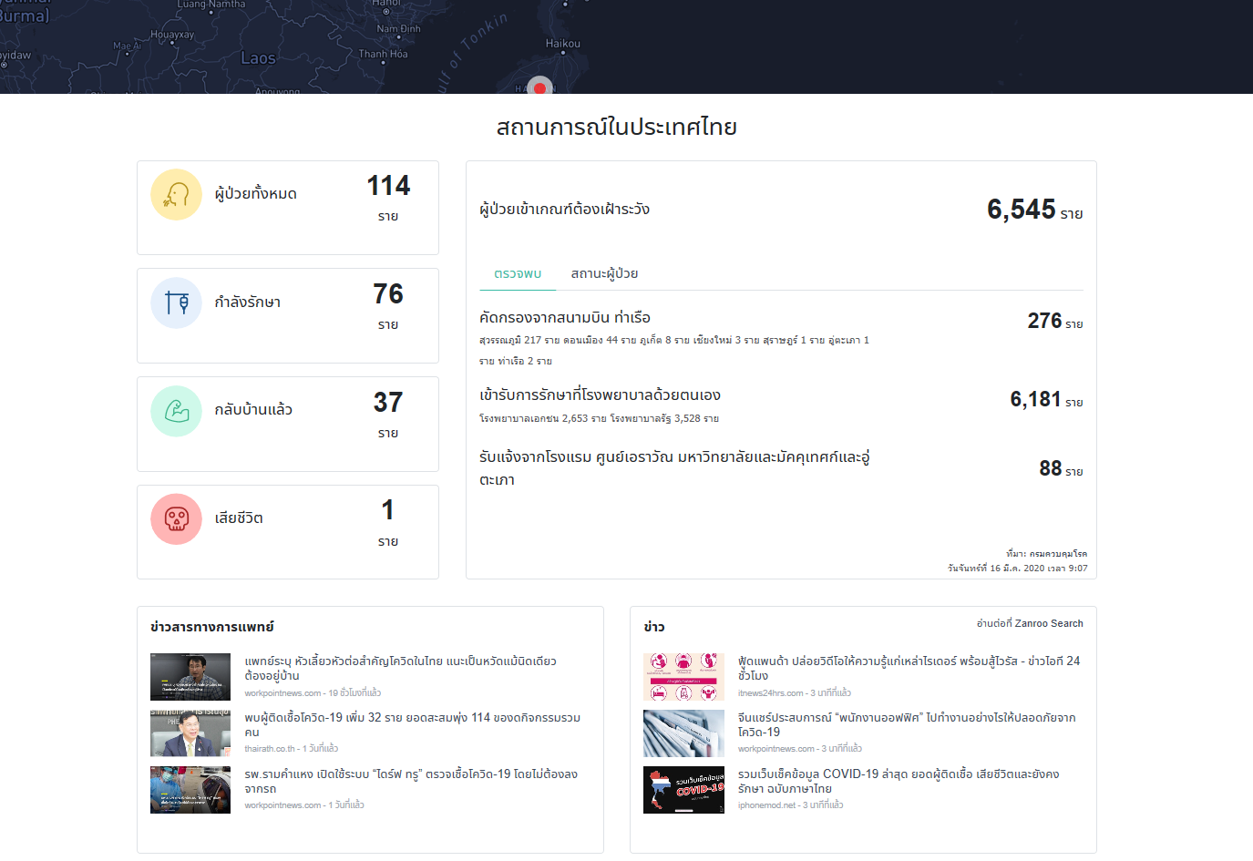 ทั้งนี้คุณสามารถเข้าไปใช้งานได้เพื่ออ่านข่าวต่างๆ เกี่ยวกับเชื้อไวรัส และข่าวการรับมือจากทางการแพทย์ รวมถึงการพูดถึงสถานการณ์ใน Social Network ที่รวบรวมมาให้จาก Twitter Facebook และ โซเชียลอื่นๆ มากมาย ไว้ที่เว็บไซต์ สำหรับสถานการณ์ในไทยตอนนี้อัปเดตจากเว็บไซต์ พบว่ามีผู้ติดเชื้อ 114 รายจากทั้งประเทศไทย และมีผู้ป่วยที่เข้าเกณฑ์เฝ้าระวังทั้งหมด 6,545 ราย