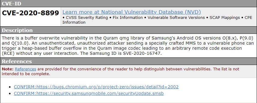 ตอนนี้ช่องโหว่ดังกล่าวได้รับชื่อทางการของช่องโหว่ (Common Vulnerabilities and Exposures) แล้ว ในรหัส CVE-2020-8899 โดยอธิบายว่าเป็นช่องโหว่ที่ผู้โจมตีใช้ MMS ที่ถูกสร้างขึ้นมาเป็นพิเศษ โจมตีสมาร์ทโฟนด้วยเทคนิค Buffer overflow ผ่าน Quram image codec ซึ่งทำให้สามารถใช้สร้างโอกาสในการโจมตีแบบ Remote code execution ได้โดยที่ผู้ใช้ไม่จำเป็นต้องตอบสนอง