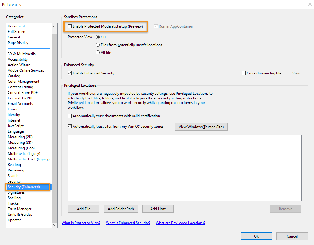 อย่างไรก็ตาม เมื่อทำการอัปเดตแล้วผู้ใช้จะต้อง เข้าไปเปิดการทำงาน Protected Mode ก่อน โดยกดเข้าไปที่เมนู Edit > Prefrences > Categories > Security (Enhanced) > Enable Protected Mode at Stratup (Preview) เพื่อเปิดการทำงานของ Protected Mode จากนั้นกดปิดโปรแกรมลงและเปิดใหม่อีกครั้ง