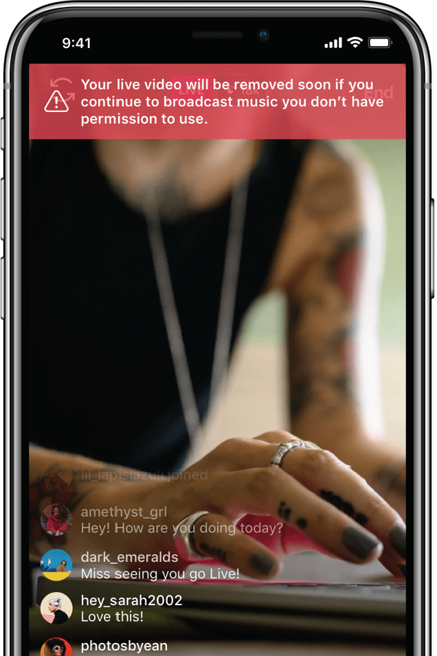 จากเดิมที่ต้องหยุด Live กลางคันเมื่อพบเสียงเพลงที่ขัดต่อกฎลิขสิทธิ์ Instagram ได้ใช้วิธีการปรากฎแจ้งเตือนในการถ่ายทอดสดแทน เพื่อให้ผู้ใช้มีเวลามากขึ้นในการลบเสียงออกโดยไม่ต้องหยุด Live อีกต่อไป ซึ่งในบล็อกของ Instagram ได้ให้คำแนะนำที่ชัดเจนยิ่งขึ้น เพื่อแก้ไขสถานการณ์ในกรณีที่ Live Streaming ถูกปิดเสียงหรือบล็อกโดยอัตโนมัติเนื่องจากการใช้เพลงที่ไม่มีใบอนุญาต