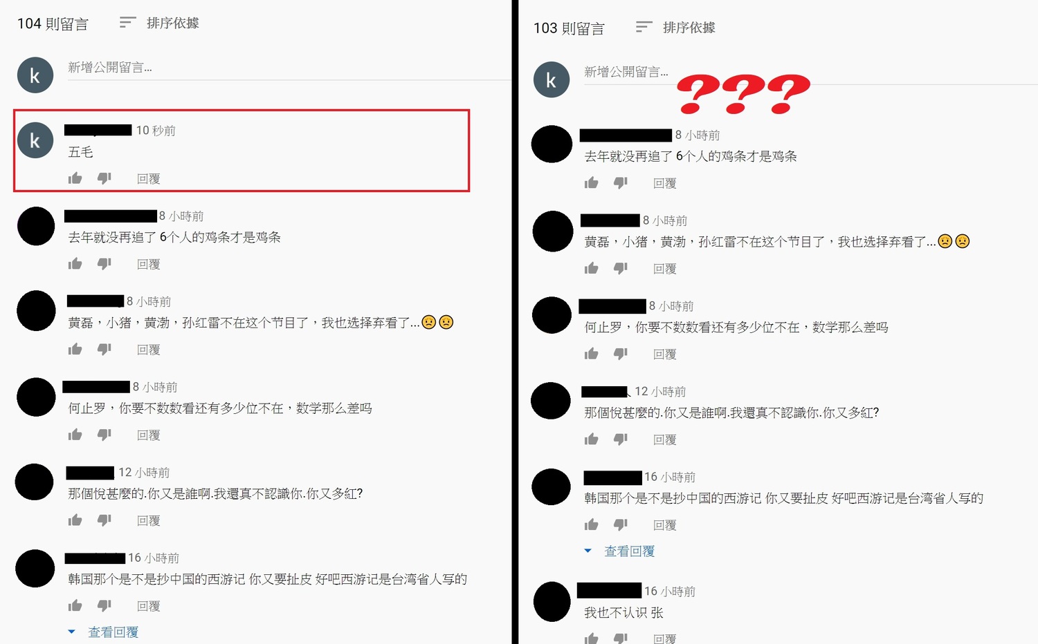 แต่การลบข้อความของ YouTube จะจัดการลบเฉพาะคอมเมนท์ที่มีคำว่า “共匪” และ “五毛” ที่เป็น ภาษาจีนเพียงเท่านั้น ไม่ได้ครอบคลุมถึงข้อความที่เป็นพินอินคำอ่าน หรือข้อความที่สื่อถึงความหมายของสองคำนี้ในภาษาอื่นแต่อย่างใด