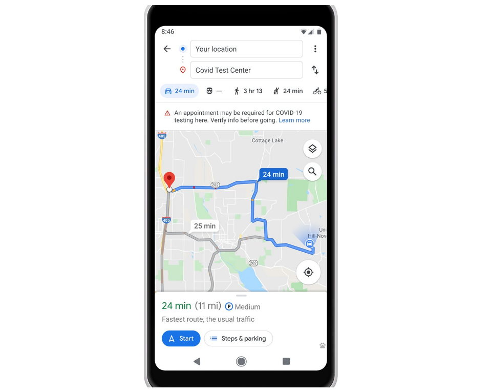 ส่วนผู้ที่จำเป็นต้องไปโรงพยาบาลหรือศูนย์สุขภาพที่เกี่ยวข้องกับ COVID-19 ก็จะมีแจ้งเตือนเพิ่มเติม เพื่อตรวจสอบแนวทางว่าควรไปโรงพยาบาลในช่วงเวลานั้นๆ หรือไม่ มีผู้ป่วยหนาแน่นไหม โดยการแจ้งเตือนส่วนนี้จะเริ่มใช้ใน 5 ประเทศแรกอย่างอินโดนีเซีย อิสราเอล ฟิลิปปินส์ เกาหลีใต้ และสหรัฐอเมริกา ส่วน Google Maps ในไทย จะมี COVID-19 Alert นำไปสู่หน้า Google Search รวมข่าวสารต่างๆ ที่เกี่ยวข้องอยู่แล้ว