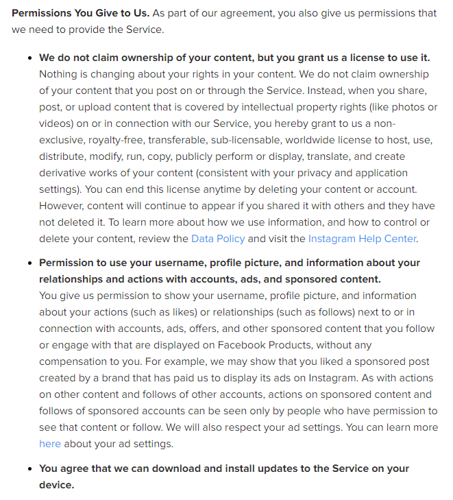 โดยจาก ข้อตกลงในการใช้งาน ก็ได้ระบุว่า “ทาง Instagram ไม่ได้เรียกร้องสิทธิในการเป็นเจ้าของผลงาน แต่เมื่อผู้ใช้ได้โพสต์รูปภาพหรือวิดีโอลงใน Instagram ก็จะถือเป็นการมอบสิทธิแบบไม่เฉพาะตัวที่ไม่มีค่าสิขสิทธิ์และสามารถถ่ายโอน, แจกจ่าย, ใช้งาน, คัดลอก, แสดงผล และแปลเนื้อหาของสิ่งที่ผู้ใช้ได้โพสต์ลงแพลทฟอร์มของเราโดยอัตโนมัติ”