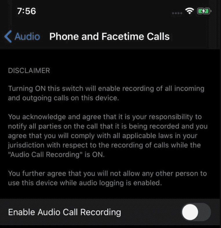 ซึ่งรายงานล่าสุดจาก Apple นั้น มีรายละเอียดเกี่ยวกับฟีเจอร์นี้ว่า ต้องได้รับความยินยอมจากผู้ใช้งานทั้งสองฝ่ายในการเปิดใช้งาน และมีแจ้งเตือนด้วยเสียงสัญญาณให้ปลายสายทราบว่า ผู้สนทนากำลังบันทึกเสียงขณะโทรอยู่ อย่างไรก็ตาม ฟีเจอร์นี้หากมาพร้อมกับ iOS 14 ก็จะเป็นสิ่งที่ขัดกับข้อกฎหมายและละเมิดความเป็นส่วนตัวในบางประเทศ ซึ่งยังไม่มีข้อมูลเพิ่มเติมว่าฟีเจอร์นี้จะใช้ได้ในบางประเทศหรือทุกประเทศทั่วโลก และสามารถเปิด-ปิดการใช้งานด้วยตัวเองได้หรือไม่