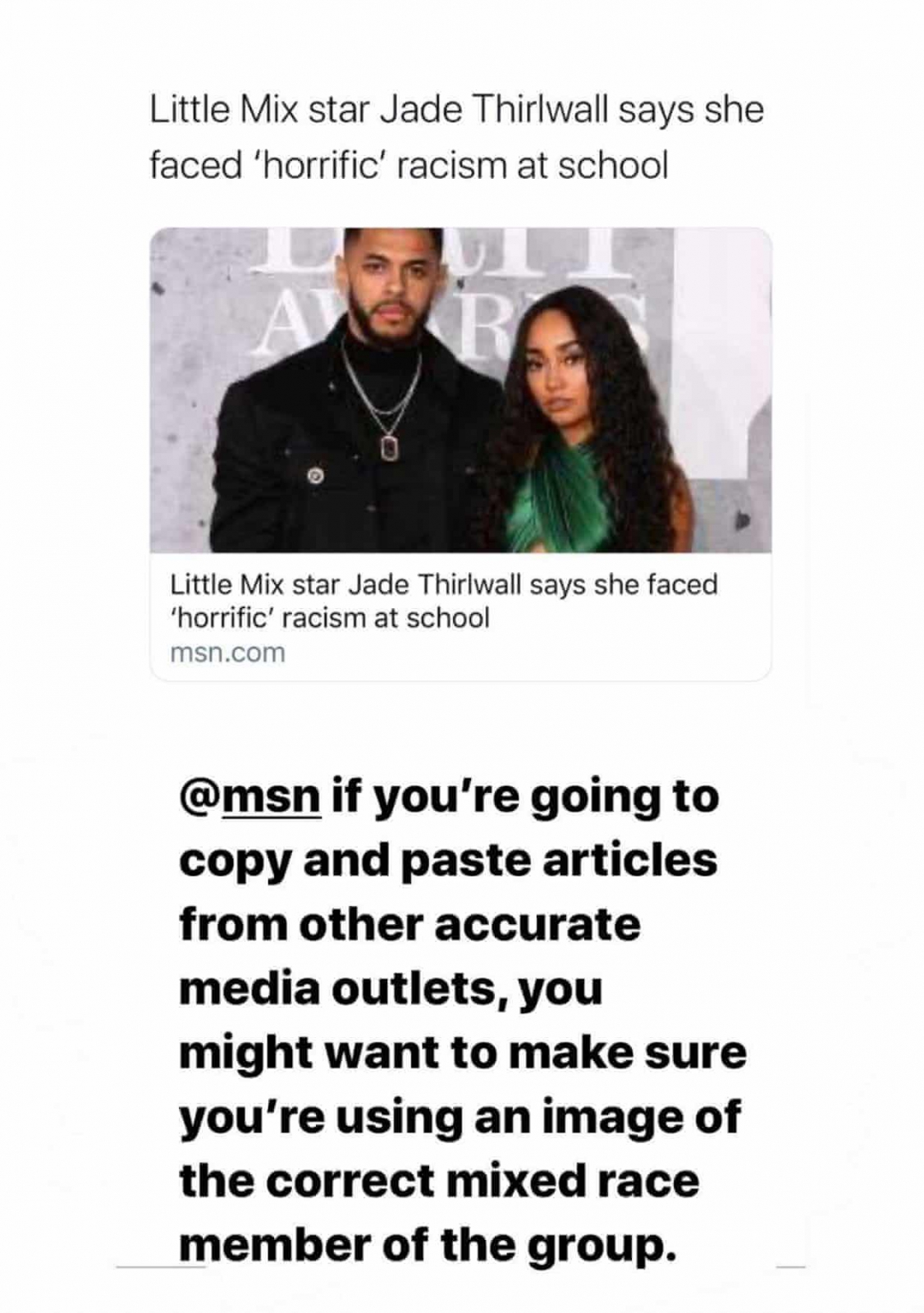 ซึ่ง Thirlwall ก็ได้สังเกตเห็นถึงข้อผิดพลาดนี้และตัดสินใจโพสต์ตำหนิ MSN ผ่าน IG Stories ของเธอว่า