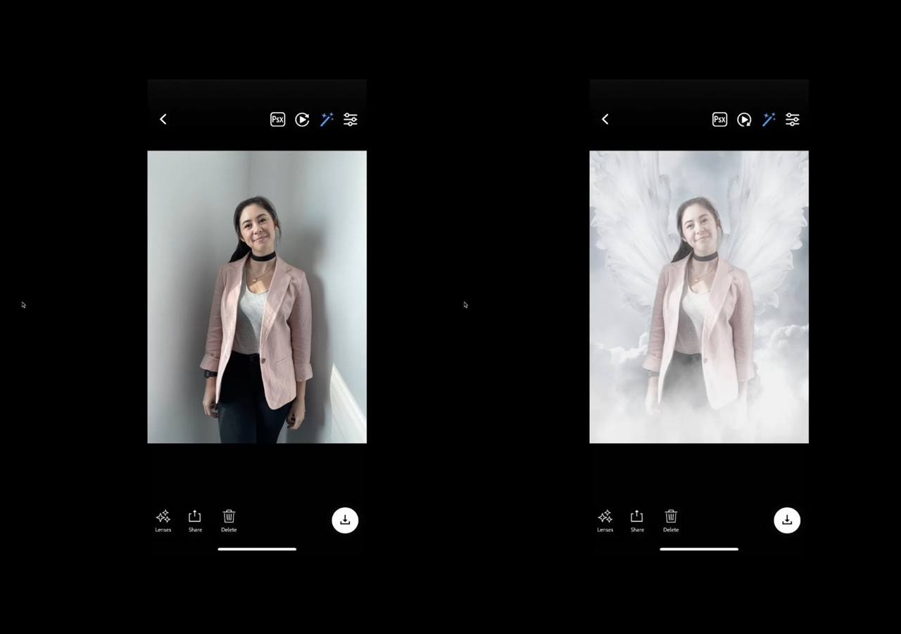 นอกจากนี้ Photoshop Camera ยังเป็นแอปถ่ายรูปแอปแรกที่สามารถเรนเดอร์รูปแบบอัตโนมัติให้เหมือนจริง และกลมกลืนไปกับแบคกราวด์ได้แบบเรียลไทม์ ด้วยการผสานความสามารถของ Adobe Sensei และ Photoshop ที่โชว์ผลลัพธ์สุดว้าวได้ในทันที เพียงแค่ใช้นิ้วสไลด์หน้าจอ (swipe) หรือแตะ (tap) ก็จะได้ภาพที่สะกดสายตาเพื่อนๆ หรือเหล่าฟอลโลว์เวอร์ เพิ่มความฮ็อตในหน้า Feed ของคุณขึ้นมาทันที!