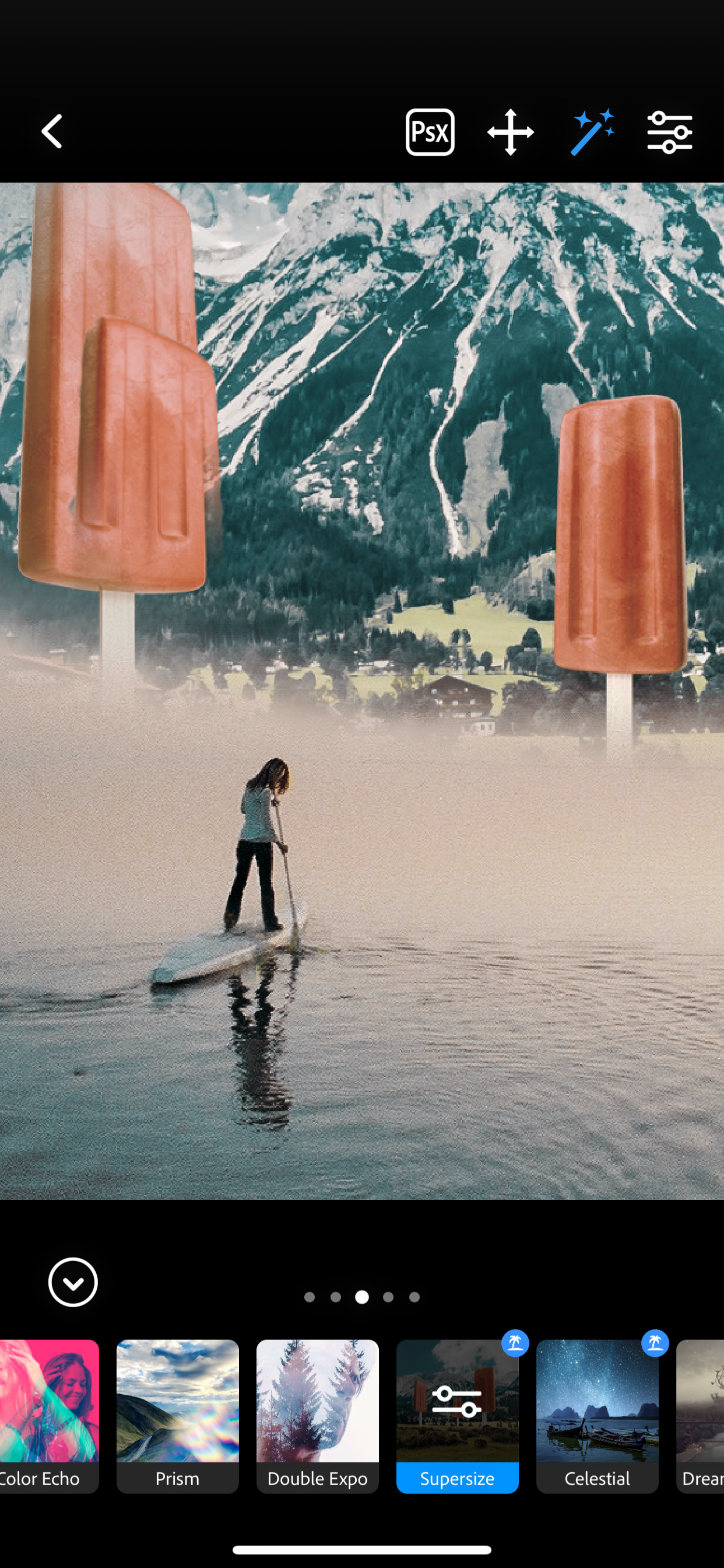 จากภาพตัวอย่างจะเห็นได้ว่า เอฟเฟคต์ใน Photoshop Camera มีความแปลกแหวกแนว สามารถเลือกได้จากด้านล่างของแอป และที่พิเศษไปกว่านั้น ยังสามารถรีทัชภาพเดิมให้เป็นภาพใหม่ได้หลายรูปแบบ