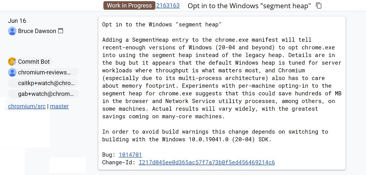 Segment Heap ถูกอัปเดตมาพร้อมกับ Windows 10 v2004 เวอร์ชันใหม่ ทำให้เบราว์เซอร์ Edge สามารถลดการใช้งานแรมลงได้ถึง 27 % และหลังจากที่ Microsoft อัปเดต Segment Heap เข้ามา ก็ประกาศว่าจะเปิดเผยซอร์สโค้ด ให้ผู้พัฒนาเจ้าอื่นนำไปใช้ด้วย จึงเป็นเหตุผลให้ Google ขอยืมมาใช้ทดสอบกับ Chrome ในวันนี้