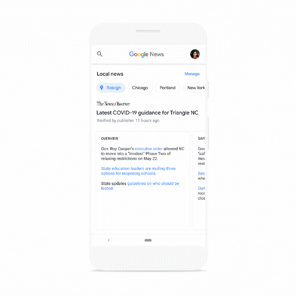 l3uchGoogle วางแผนว่าจะนำเอาข่าวเกี่ยวกับการแพร่ระบาดของ COVID-19 ภายในพื้นที่ต่างๆ เข้ามาเสริมในแอปพลิเคชัน Google News โดยเบื้องต้นได้ทำการคัดเลือกข่าวจากสำนักข่าวท้องถิ่นที่มีความน่าเชื่อถือจากเมืองต่างๆ ถึง 21 สำนักข่าวใน 21 รัฐของสหรัฐอเมริกามาทดลองระบบก่อน