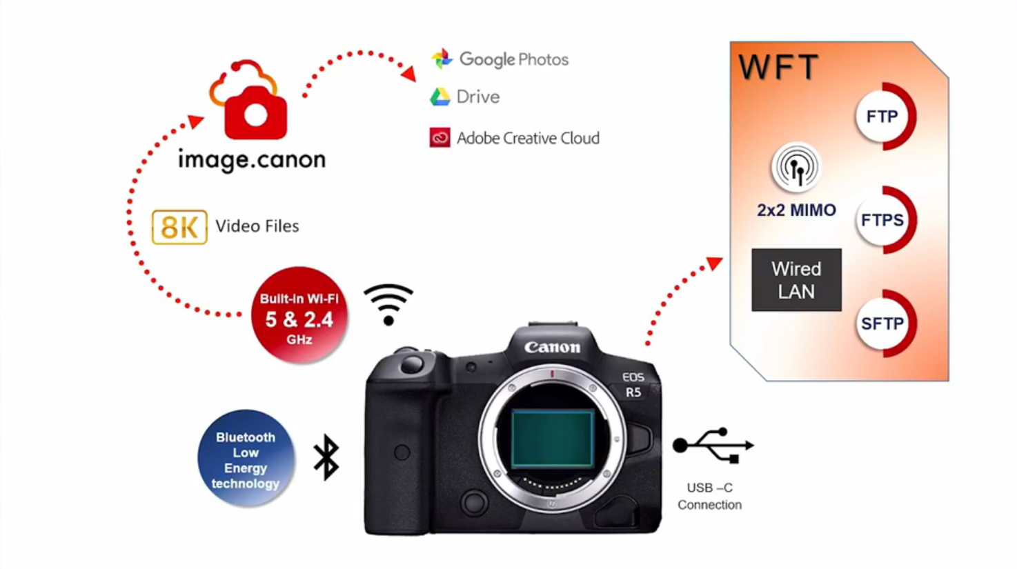 - รองรับการเชื่อมต่อแบบไร้สาย ทั้งการเก็บข้อมูลบนคลาวด์อย่าง image.canon ใช้งานร่วมกับบริการฝากไฟล์อื่นๆ อย่าง Google Drive, YouTube และ Adobe Creative Cloud ได้ รองรับ Wi-Fi 5GHz และ 2.4GHz เพื่อการถ่ายโอนข้อมูลด้วยความเร็วสูงไปยังเครื่องคอมพิวเตอร์หรือสมาร์ทดีไวซ์ต่างๆ รวมถึงการส่งข้อมูลไปยังเซิร์ฟเวอร์ FTP และยังสามารถใช้ร่วมกับอุปกรณ์ส่งข้อมูลไร้สาย WFT-R10 และ Bluetooth ร่วมกับแอปพลิเคชัน Camera Connect เพื่อการแท็กสถานที่ในภาพและการควบคุมกล้องจากระยะไกล