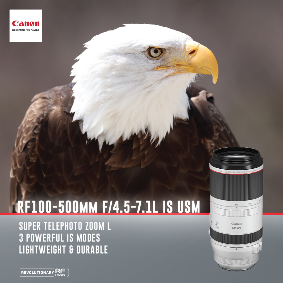 RF100-500mm f/4.5-7.1L IS USM ใช้ชิ้นเลนส์ UD 6 ชิ้น และเลนส์ Super UD 1 ชิ้นที่จัดเรียงอยู่ใกล้กับระนาบโฟกัส ทุกชิ้นเลนส์เคลือบด้วย ASC (Air Sphere Coating) ลดการเกิดภาพหลอก (ghosting) แก้ไขความคลาดเคลื่อนของภาพ และให้ความคมชัดจนถึงขอบภาพตลอดทั้งช่วงทางยาวโฟกัส มีระบบป้องกันภาพสั่นไหวแบบออปติคัล สูงสุด 5 สต็อป และมีสวิตช์ปรับโหมดระบบกันสั่นให้เลือก 3 โหมด สำหรับการถ่ายภาพสิ่งที่อยู่นิ่ง การถ่ายภาพที่มีการแพนกล้อง และการถ่ายภาพการเคลื่อนไหวที่ไม่แน่นอน เช่น การแข่งขันกีฬาต่างๆ เมื่อใช้เลนส์นี้กับกล้อง EOS R5 และ EOS R6 ที่มีระบบกันสั่นแบบ 5 แกนในตัวกล้อง จะช่วยลดการสั่นของภาพได้ถึง 6 สต็อปที่ทางยาวโฟกัส 500 มม. ผู้ใช้จึงสามารถถ่ายภาพด้วยความเร็วชัตเตอร์ต่ำในที่แสงน้อยเพื่อให้ได้ภาพที่สว่างขึ้น