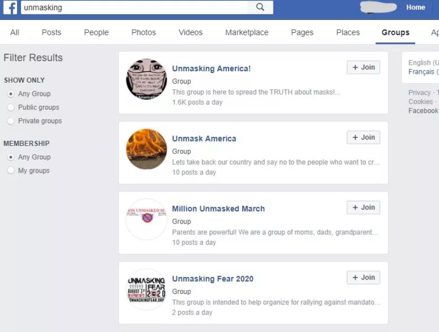 ข้อความข้างต้น คือหนึ่งในโพสต์จากเพจ "Unmasking America!" ตามการรายงานของ The Verge ซึ่งนอกจากจะมีกลุ่มนี้แล้ว หากค้นหาในเฟซบุ๊คว่า Unmasking จะพบว่ามีกลุ่มลักษณะเดียวกันอยู่มากมายเลยทีเดียว และแต่ละกลุ่มมีสมาชิกไม่ต่ำกว่า 1,000 คน ซึ่งทุกกลุ่มล้วนเป็นกลุ่มปิด เช่นกลุ่ม 'Million Unmasked Macrch' ที่มีสมาชิก 7,800 คน พวกเขารวมตัวกันในฐานะพ่อแม่ พี่น้อง ลุง ป้า น้า อา ที่พยายามเรียกร้องให้ยกเลิกการใส่หน้ากากในโรงเรียน ซึ่งส่งผลกระทบต่อสภาพจิตใจของเด็ก (ก็พอจะเข้าอกเข้าใจส่วนหนึ่งสำหรับกลุ่มนี้)