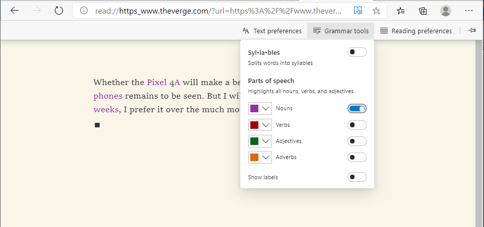 - Open in Immersive Reader (มีอยู่ในทุกแอปฯ ของ Microsoft 365) ช่วยให้การอ่านบทความง่ายมากขึ้น เช่นเน้นสีที่คำ ประธาน กริยา และกรรม รองรับเฉพาะภาษาอังกฤษ
