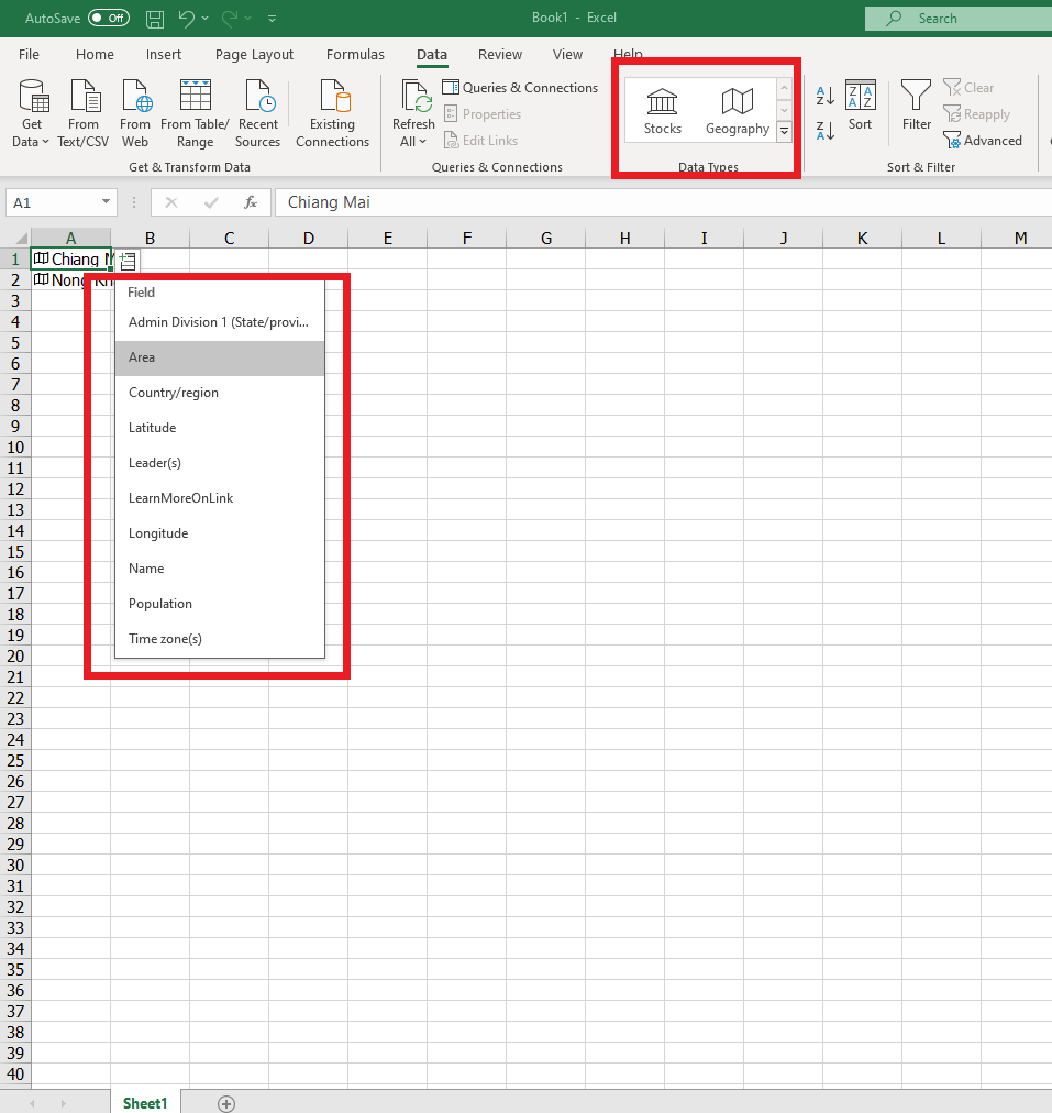 - Data Geography สามารถดึงฐานข้อมูลจากเบราว์เซอร์ Edge มาใส่ในตารางให้อัตโนมัติ เช่นหากพิมพ์ชื่อจังหวัดลงไป คลิกที่ Geography จะสามารถแสดงข้อมูล Fact จากเว็บไซต์ ได้ เช่น ประชากร ขนาดพื้นที่ หรือแม้แต่ชื่อผู้ว่าประจำจังหวัด