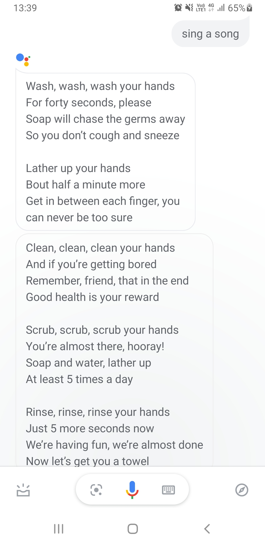 หากใครส่งคำสั่งเสียงหรือพิมพ์ข้อความลง Google Assistant ว่า "Sing a Song" จากเดิมที่ระบบตั้งให้ร้องเพลง Twinkle Twinkle Little Star ตอนนี้กลายเป็นบทเพลงใหม่ที่เตือนให้ผู้ฟังใส่หน้ากาก ล้างมือให้สะอาดแทน ซึ่งเนื้อเพลงมีดังนี้
