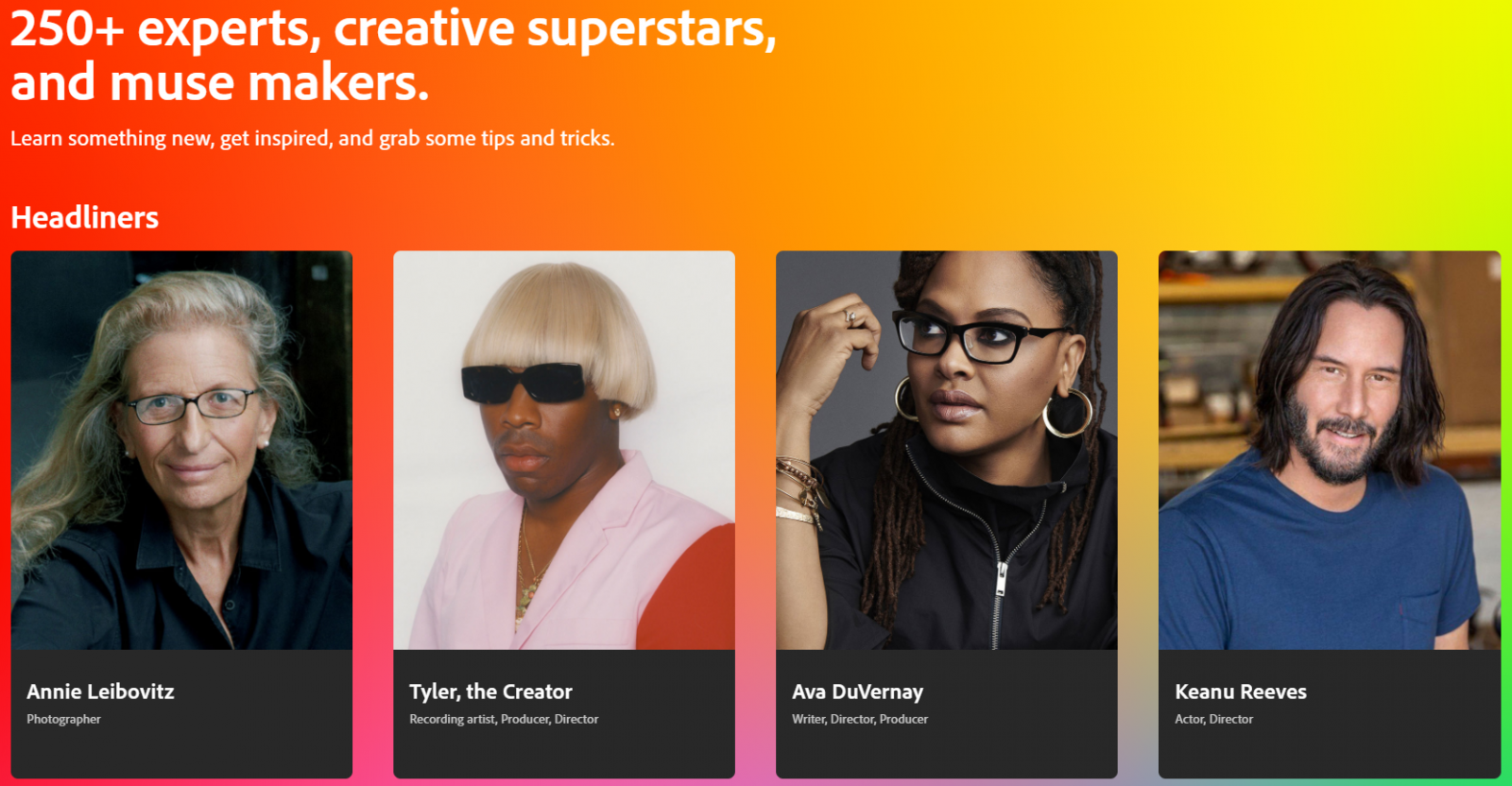 โดยทาง Adobe ได้เชิญผู้เชี่ยวชาญมาร่วมบรรยายในหัวข้อต่างๆ กว่า 250 คน รวมทั้ง แขกรับเชิญพิเศษ ไม่ว่าจะเป็น Ava DuVernay (ผู้กำกับที่เคยคว้ารางวัล Academy Award), Annie Leibovitz (ช่างภาพ), Tyler, the Creator (แรปเปอร์), นักแสดงชื่อดังอย่าง Keanu Reeves และแขกรับเชิญชื่อดังอีกมากมายมาร่วมงานนี้ด้วย (ตอนนี้ทาง Adobe ได้เผยรายชื่อผู้บรรยายออกมาราว 165 คนแล้ว)
