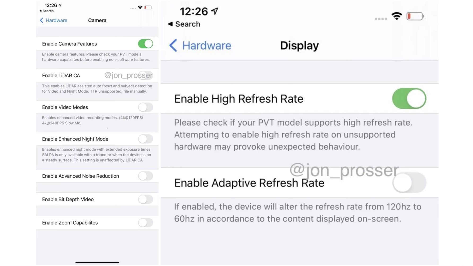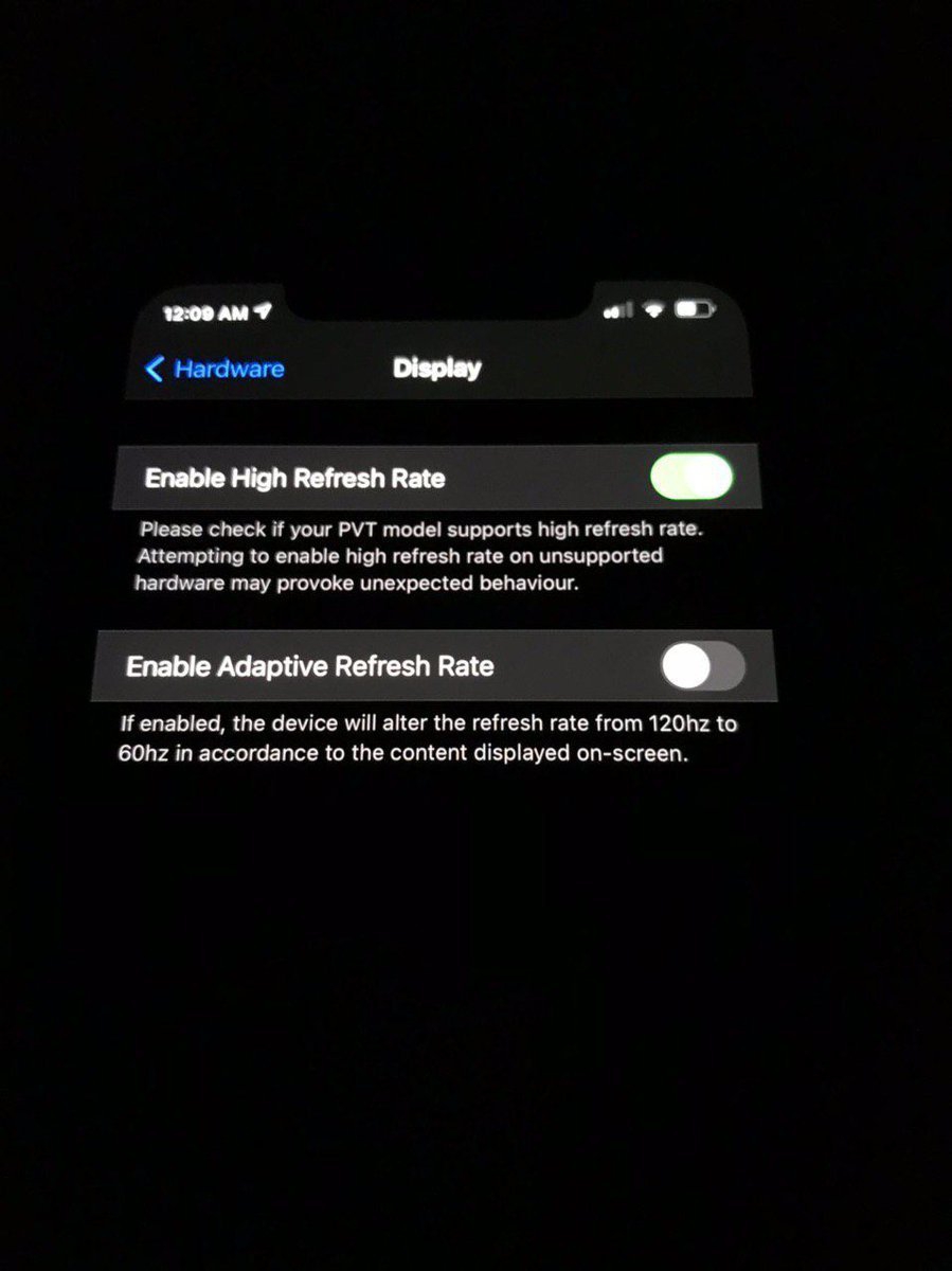 อย่างที่ข่าวลือทั้งหลายเคยว่าไว้ว่า iPhone 12 Pro Max อาจมีหน้าจอแสดงผลที่มีรีเฟรชเรต 120Hz และสามารถการปรับค่ารีเฟรชเรตได้ แต่ยังไม่ทราบแน่ชัดว่าจะสามารถเปิด-ปิดอัตรารีเฟรชเรต 120Hz ได้ตามใจชอบ หรือจะใช้การปรับค่าอัตโนมัติระหว่าง 60Hz และ 120Hz แล้วแต่เนื้อหาที่เปิดบน iPhone ในขณะนั้น