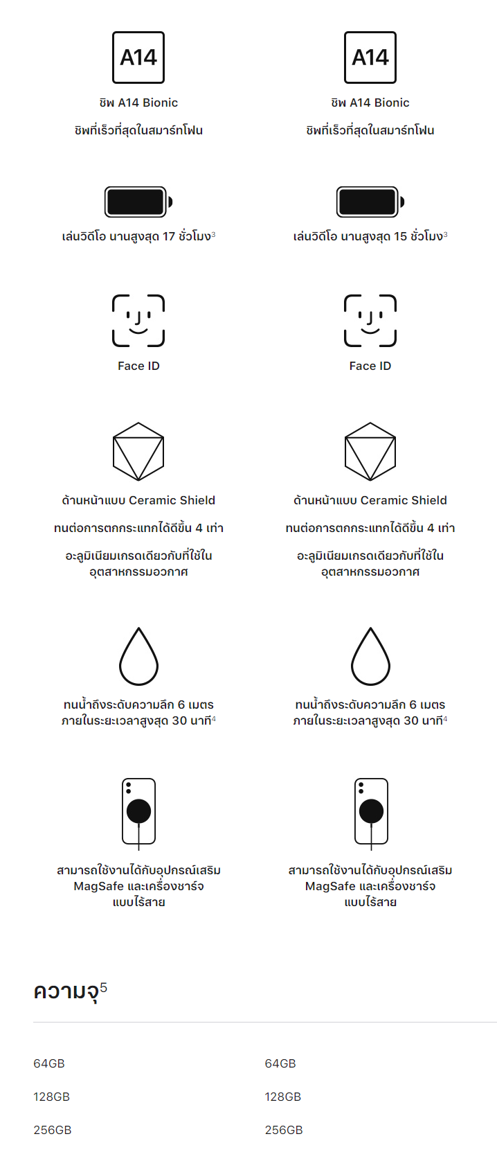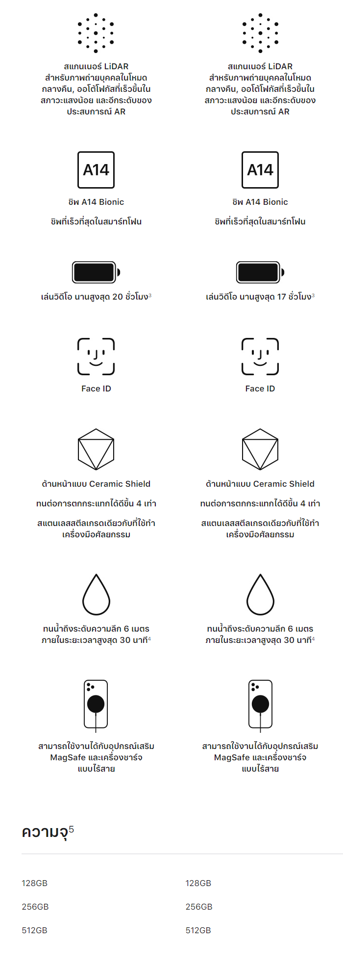 ส่วนความจุของ iPhone 12 Pro และ iPhone 12 Pro max มีให้เลือก 3 ขนาด ได้แก่ 128/256 และ 512GB ส่วนสเปกภายในก็เหมือนๆ กับ iPhone 12 อย่างชิป Apple A14 Bionic และรองรับการเชื่อมต่อ 5G