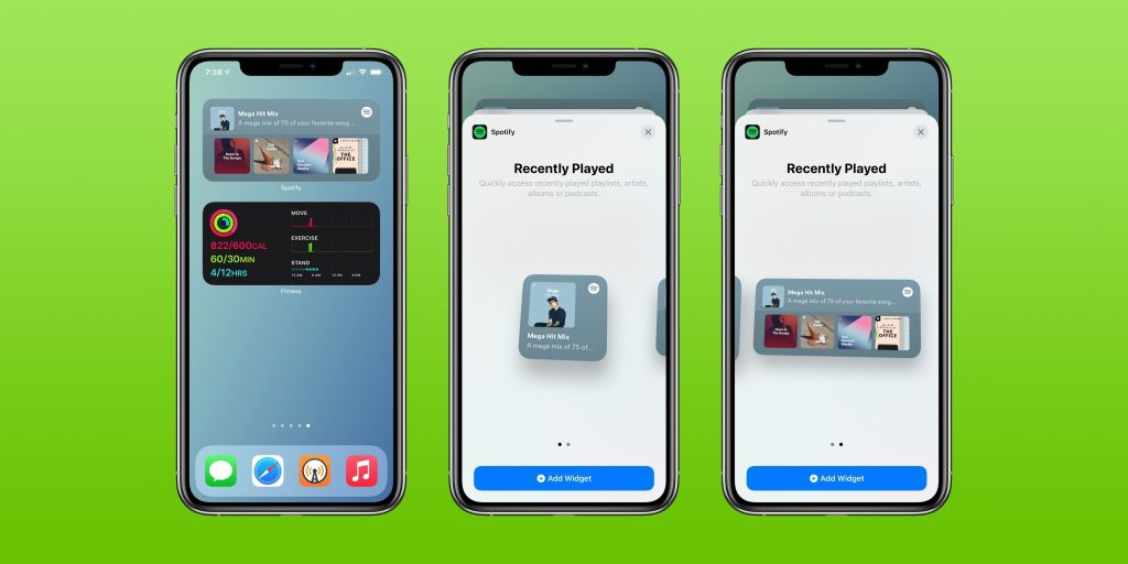 ซึ่งหลังจากที่ผู้ใช้จำนวนมากเรียกร้องเข้ามา ทาง Spotify ก็ได้เพิ่ม Widget เข้ามาบน iOS 14 แล้วเป็นที่เรียบร้อย โดย Widget ของ Spotify นี้จะมีทั้งหมด 2 ขนาด คือ Widget ขนาดเล็ก (สี่เหลี่ยมจตุรัส 1x1) ที่จะมีการแสดงผลข้อมูลสิ่งที่ผู้ใช้ฟังล่าสุด และ Widget ขนาดกลาง (สี่เหลี่ยมผืนผ้า 2x1) ที่จะมีการแสดงผลสิ่งที่ฟังล่าสุดอยู่แถวบน และแถวล่างจะเป็นสิ่งที่ผู้ใช้ฟัง 4 อันดับถัดไปจากนั้น