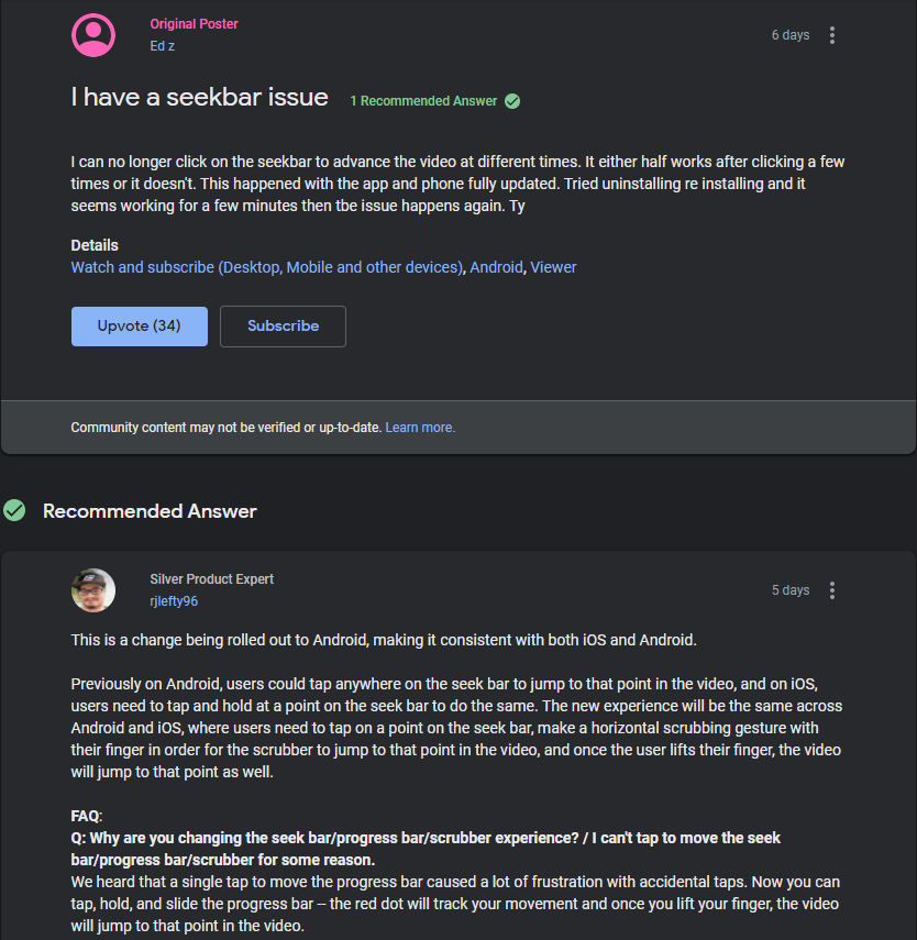 และในกระทู้แจ้งปัญหาดังกล่าวก็มีผู้ใช้รายหนึ่ง (rjlefty96) ที่เป็น Silver Product Expert (หนึ่งในผู้ร่วมโครงการผู้เชี่ยวชาญด้านผลิตภัณฑ์ของ Google) เข้ามาตอบข้อสงสัยของผู้ใช้ว่า ทางบริษัทได้ ปรับระบบการใช้งาน YouTube บน Android ให้เหมือนกับบน iOS และได้ยกคำตอบใน FAQ มาชี้แจงดังนี้