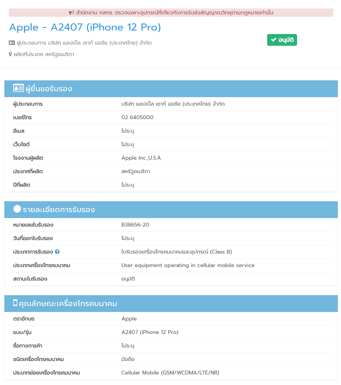 โดยภาพข้างต้นเป็นภาพจากเว็บไซต์ตรวจสอบอุปกรณ์รับส่งสัญญาณวิทยุของ กสทช. จะเห็นได้ว่าในเว็บมีข้อมูลเกี่ยวกับ iPhone 12 รหัส A2403 และ iPhone 12 Pro รหัส A2407 ซึ่งตรงกับข้อมูลในวันเปิดตัว iPhone ว่าจะวางจำหน่าย iPhone 12 และ iPhone 12 Pro ก่อน 2 รุ่นแรก ก่อนที่ iPhone 12 Mini และ iPhone 12 Pro Max จะตามมา