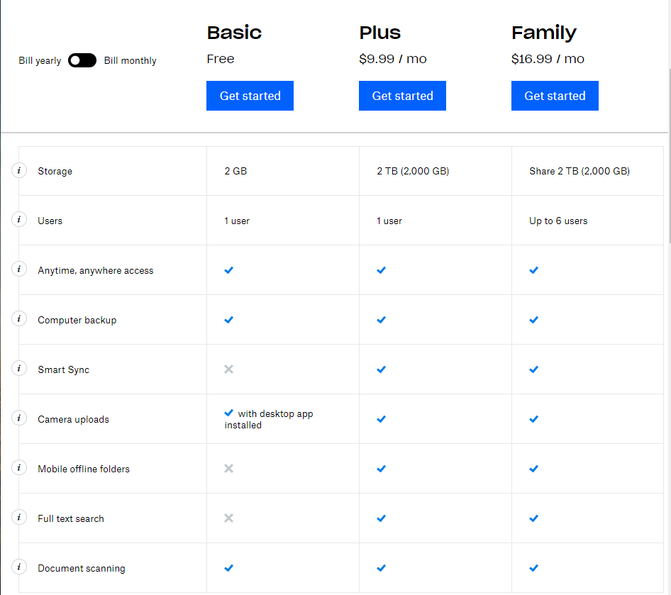 ปกติ Dropbox จะมีแพ็กเกจ 'Basic' ให้บริการฟรีและสามารถอัปเกรดเป็น 'Plus' ในราคา 9.99 ดอลลาร์ หรือประมาณ 315 บาทเพื่อรับสิทธิประโยชน์เพิ่มเติมได้ ซึ่งมีการจำกัดผู้ใช้เพียงบัญชีเดียวเหมือนเดิม โดยความแตกต่างระหว่าง แบบฟรี กับ แบบเสียเงิน นั้น ประกอบด้วย ความจุที่เก็บไฟล์, ข้อจำกัดปริมาณการอัปโหลดไฟล์ต่อ 1 ครั้ง, การเรียกใช้งานไฟล์บนมือถือแม้ไม่มีอินเทอร์เน็ต ไปจนถึงมาตรการความปลอดภัยที่เพิ่มขึ้น โดยสามารถเช็คข้อเปรียบเทียบอย่างละเอียดได้ที่ลิงก์ใต้ภาพ