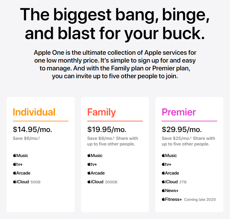 โดยบริการ Apple One นี้จะแบ่งออกเป็น 3 แพ็กเกจ คือ Individual ที่รวมบริการ Apple Music, Apple TV+, Apple Arcade และ iCloud อีก 50GB ในราคา 14.95 ดอลลาร์สหรัฐ (ราว 465 บาท), Family จะเพิ่มพื้นที่บน iCloud เป็น 200GB ในราคา 19.95 ดอลลาร์สหรัฐ (ประมาณ 620 บาท) และ Premier ที่จะเพิ่มบริการ Apple News+ และ Apple Fitness+ รวมทั้งพื้นที่บน iCloud เพิ่มเป็น 2TB ในราคา 29.95 ดอลลาร์สหรัฐ (ราว 930 บาท) โดยแพ็กเกจ Family และ Premier จะสามารถใช้งานได้สูงสุด 6 คน