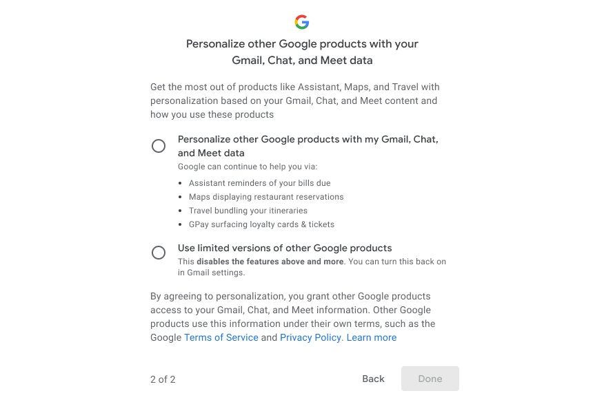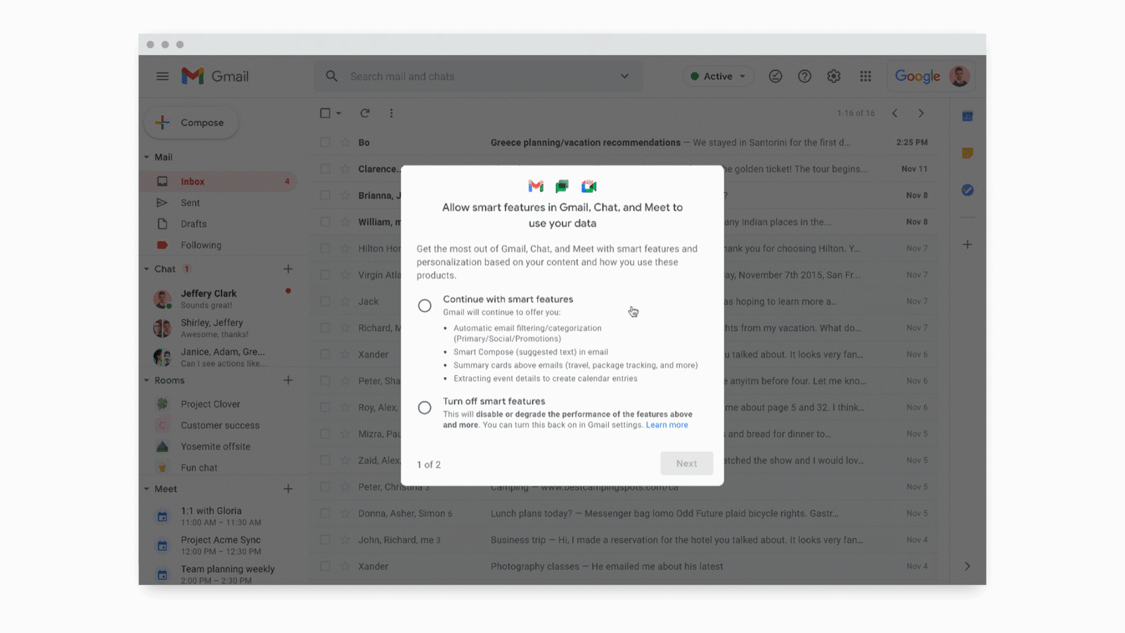 ล่าสุด Google ประกาศว่าจะเพิ่มเมนูการตั้งค่าบน Gmail ใหม่ ให้ผู้ใช้เลือกปิดฟีเจอร์บางตัว ในกรณีที่ไม่ต้องการใช้ได้ เช่น พวก Smart Features ต่างๆ อย่างระบบ Automatic email filtering/categorization (กรองข้อมูล และจัดหมวดหมู่อีเมลอัตโนมัติ) และ Smart Compose (AI ช่วยแนะนำการใช้คำในการส่งอีเมล)